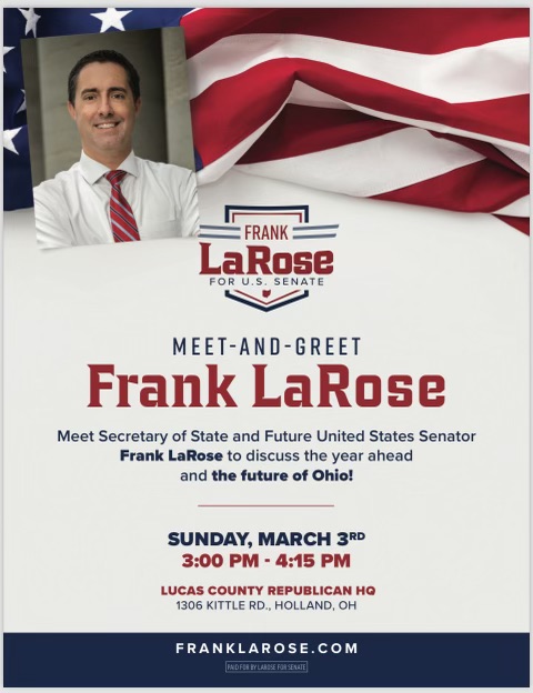 Ohio Secretary of State Frank LaRose, candidate for U.S. Senate, will be at the Lucas County Republican Party Headquarters this Sunday from 3:00PM – 4:15PM for a Meet & Greet event!