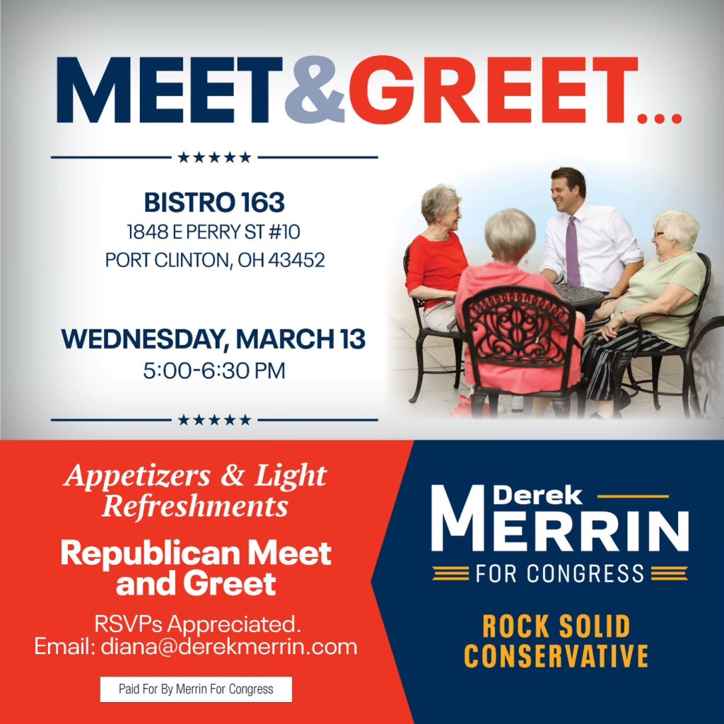 Derek Merrin, Candidate for Ohio’s 9th Congressional District is having meet and greets this week! If you would like to attend any of these events RSVP’s are appreciated and can be emailed to diana@derekmerrin.com . Be sure when emailing to be clear on which event you are attending!